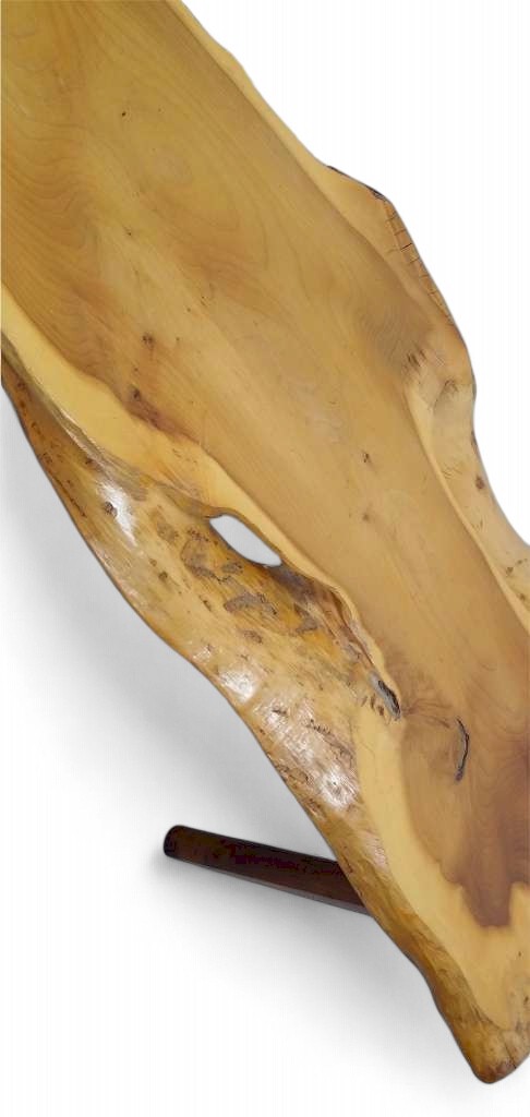 Live edge , Mid Century modern coffee table in yew wood , of freeform organic design , showing the naturalistic appearance of the wood . Made by Reynolds of Ludlow , it has an ink stamp to the underside .