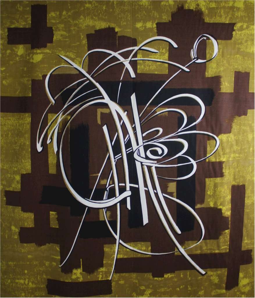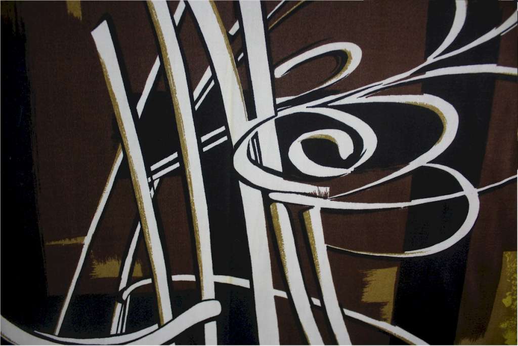 "Ling" for Tootal .Roll of screen painted furnishing fabric of abstract design in brown and white. Measures 122 cm wide x 15 metres